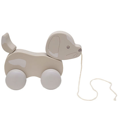 Fun That's Mine in wood pull along toy in the shape of a dog on wheels in beige.