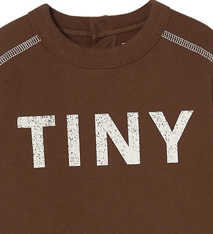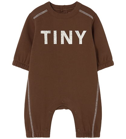 Beautiful Tiny Cottons jumpsuit in dark brown sweat with decorative white stitching, and on the front it says "Tiny" printed in large white letters.