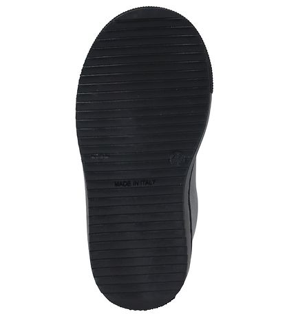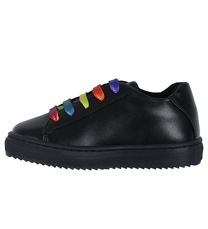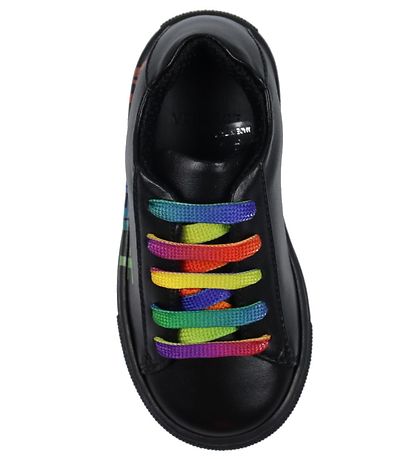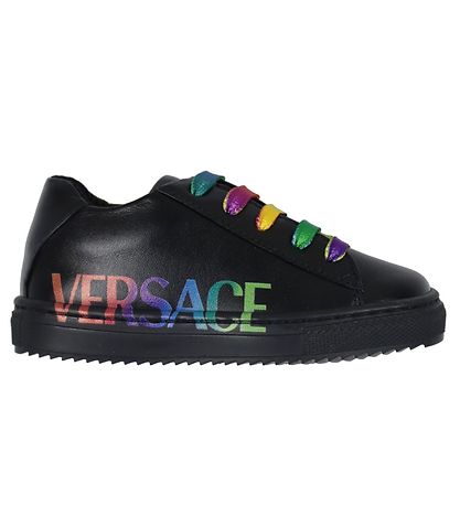 Nice Versace shoe in black leather with the name "Versace " printed on the outside and with colorful shoelaces.
