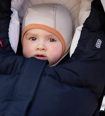 In the back there are openings that fit a pram harness, and a piece of the back is attached with velcro and can therefore be removed so that there is an opening, so it is easy to fasten the child in the harnesses on the stroller, pram or car seat, without the child having to get out of the warm footmuff. As a practical detail, on the left side of the cap there is a mark in imitation leather, which can be used to attach a dummy clip.