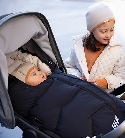 Fine Voksi footmuff in the Move model in plain black and with a cream-colored lining.