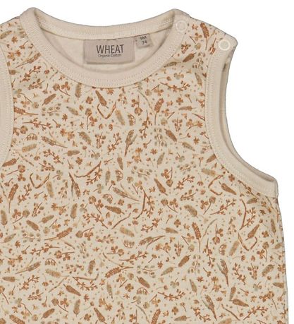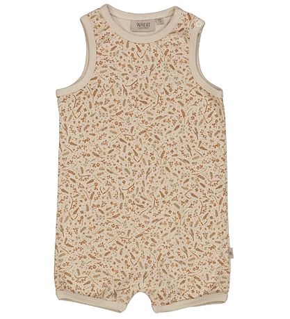 The Wheat summer romper has wide shoulder straps and short legs, and in all openings there are narrow ribbed edges. The suit can be opens at the left shoulder and between the legs with practical push buttons.
