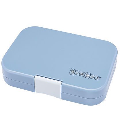 The Yumbox lunchbox has a square shape, and it has a fixed lid, which opens at the front with a clip. Inside, the lunchbox has a removable compartment divider with one large compartment, two smaller compartments and one little, round compartment for dipping or similar. In the lid, there is soft silicone, which closes tightly around the room divider.