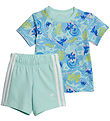 The adidas Performance t-shirt has short sleeves, a narrow wide ribbed edge at the neck opening, and it can be opened at the right shoulder with push buttons. The Shorts have a loose fit, and they have a good elastic at the waist. The Shorts are made of light cotton jersey.