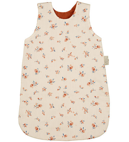 Fine Cam Cam Copenhagen doll sleeping bag, which on one side is white with a beautiful allover print of berry plants in red and blue, and on the other side is in uniform red.
