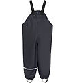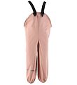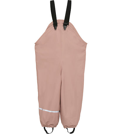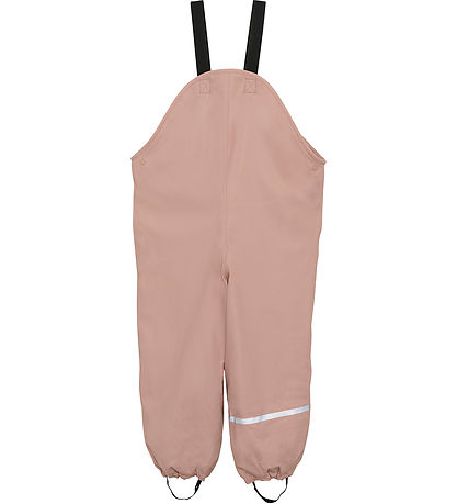 Fine CeLaVi rain pants in dusty pink with black suspenders. There is a reflective strip around the right leg.