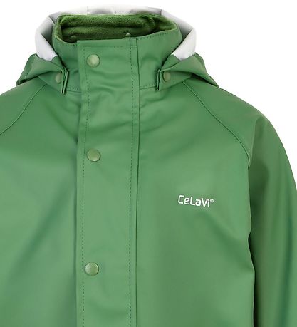 Beautiful CeLaVi rainwear consisting of a rain jacket and a pair of rain pants in solid green.