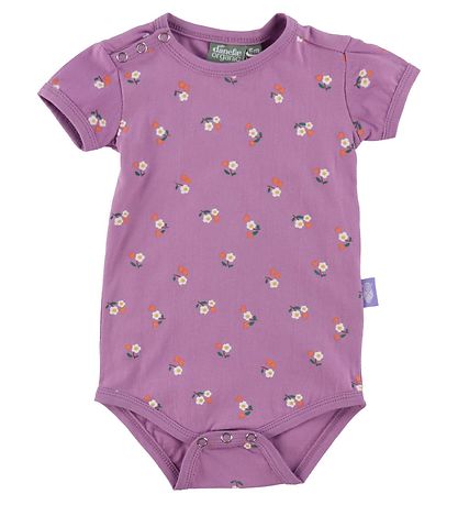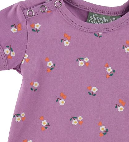 Sweet Danefæ bodysuit in purple with an all-over-print of small flowers and hearts.