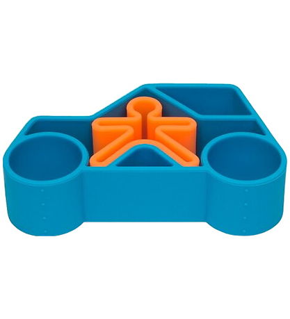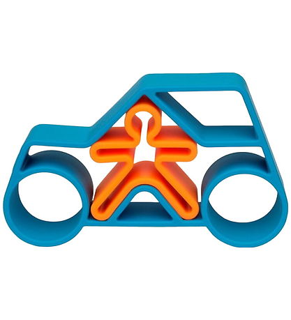 Smart Dëna teething toy, which consists of a blue car and an orange figure that fits into the car.