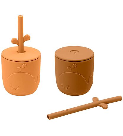 Practical Done By Deer cup with straws in 2 different shades of brown sold in a 2-Pack. On the side of the cups is a whale with water spraying up. The straws have a drop of water on each side so it looks like it comes from the whale.