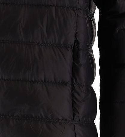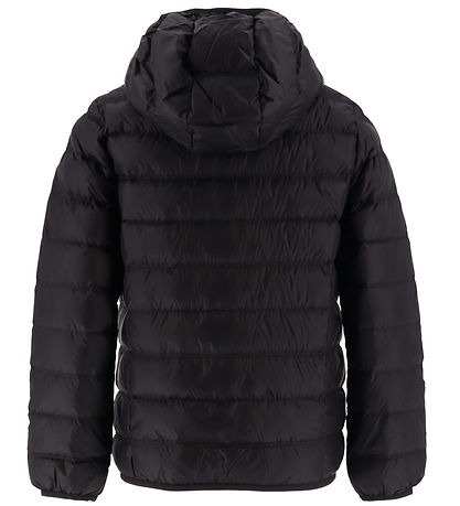 Lovely EA7 down jacket in plain black in a smooth woven quality, and on the front on the left side there is a printed silver logo.