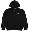 The Fila hoodie has long sleeves with a wide ribbed edge. The cap has a drawstring that can be tightened and tied. On the left chest, there is a nice logo and both sleeves have a pocket which opens with velcro. On the stomach, there is a large open pocket. At the bottom of the hoodie, there is an elastic cord that can be tightened.