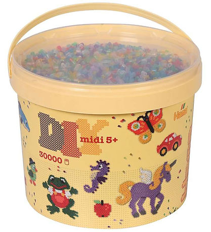 The Hama beads come in a large bucket with a transparent lid that contains 30,000 Midi beads.