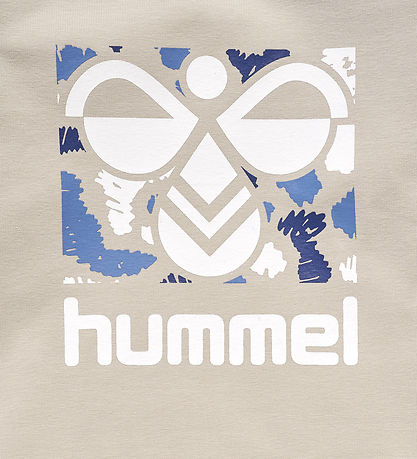 Smart Hummel bodysuit in beige with a square print on the front in white and blue shades, with the brand's logo and name in white in the middle.