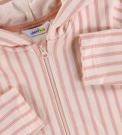 Charming Joha cardigan in a light rose shade with fine stripes. The Cardigan has a sewn-in, soft hood and long sleeves. There is a full-length zipper at the front and stitching at the bottom, which gives fine folds and a feminine look. The inside is soft, lightly brushed cotton.