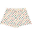 Stylish Konges Sløjd sweat shorts in off white with horizontal red stripes and a blue logo print on the left thigh. The Shorts have an elastic waist and a practical lace closure. The fabric is soft with a comfortable texture.