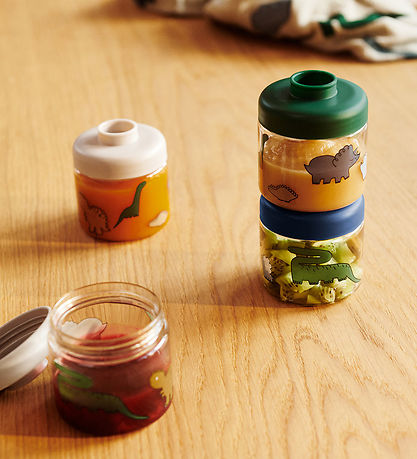 Good Liewood food containers sold in a 4-Pack with a cool print of dinosaurs and lid in different colours.