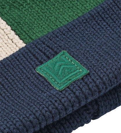 Stylish Liewood beanie with a delicate, two-tone division in beige and green knitted. The hat's edge has a contrasting, blue rib structure. On the front, it is adorned with a discreet, green Liewood logo, which gives it a simple expression.
