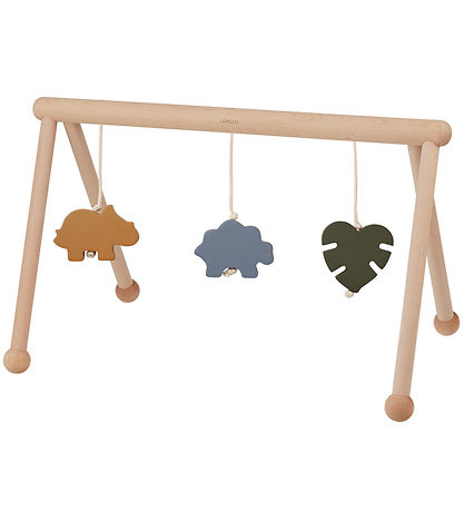 The Liewood play gym has four stable legs and is very entertaining for the smallest. The stand comes with two clutching toy in the form of a brown dino, a blue dino and a dark leaf, all of which can be hung on the stand's upper pole to entertain the kid.