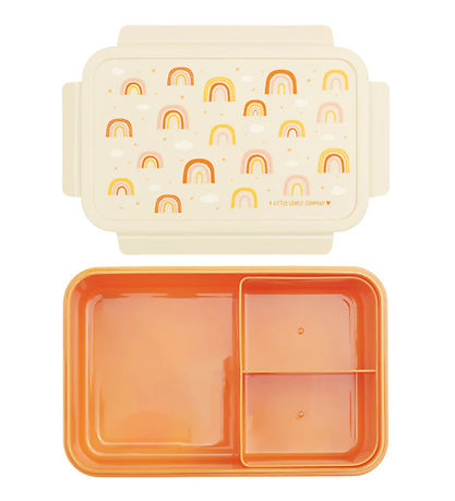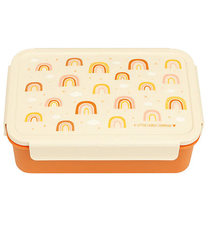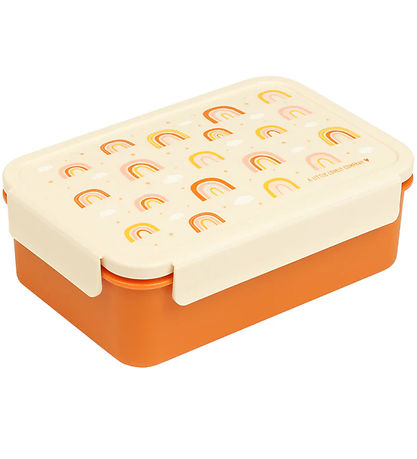 Beautiful A Little Lovely Company lunchbox in burnt orange, with a white lid with a print of sweet rainbows, stars and clouds in fine shades on top.