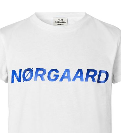 Beautiful Mads Nørgaard T-shirt in white with a shiny logo print on the chest in blue.