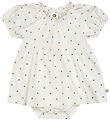 Nice Müsli bodysuit with short sleeves in white with a discreet floral pattern. The Müsli bodysuit has practical push buttons at the shoulder and between the legs, which makes it easy to take on and off.