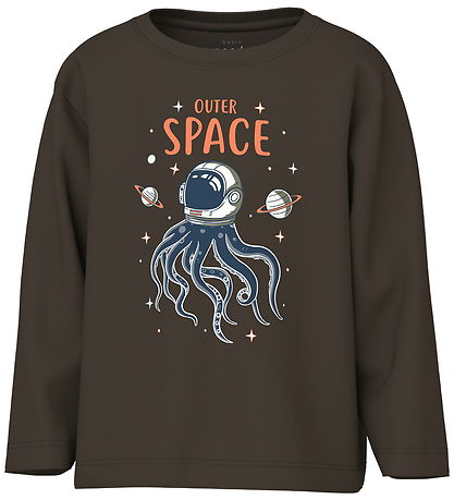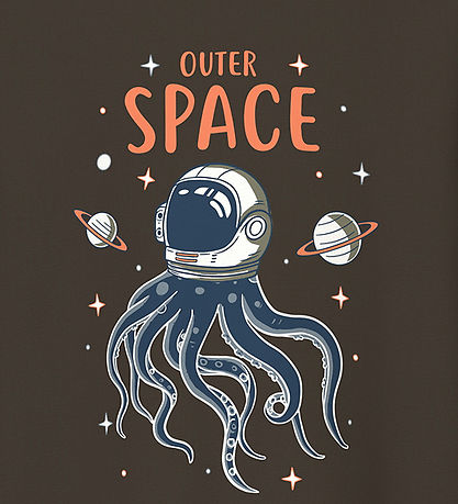 Cool Name It blouse in brown with a large print in blue, orange and white of an squid in space and the text "Outer Space". The Blouse has a round neckline with a narrow ribbed edge and long sleeves.