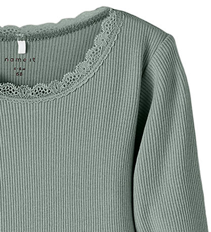 Elegant Name It bodysuit in a dusty green shade. The Bodysuit has a fine ribbed structure and a delicate lace edge at the neckline, which adds a discreet touch. The Name It bodysuit has long sleeves, which ensures a good fit. At the bottom there is a practical closure with push buttons, which makes it easy to open and close the bodysuit.