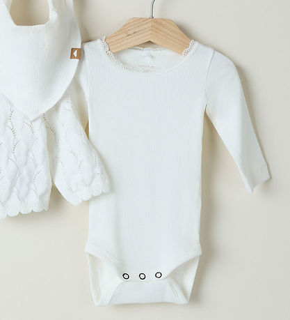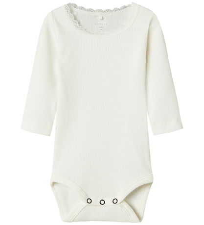 Elegant Name It bodysuit in cream white. The Bodysuit has a fine ribbed structure and a delicate lace edge at the neckline, which adds a discreet touch. The Name It bodysuit has long sleeves, which ensures a good fit. At the bottom there is a practical closure with push buttons, which makes it easy to open and close the bodysuit.