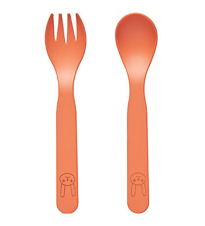 Fine OYOY cutlery in orange with a print of rabbits at the end of the handle.