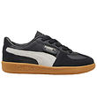Great Puma shoes with a black leather surface with black suede details, with the classic Puma stripe in beige on the sides. On the outside is the text "Puma Palermo" in gold.