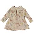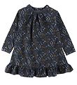 The Smallstuff dress has long sleeves, and at the neckline there is a narrow ribbed edge. In front there are beautiful pleats. The dress has a nice A-line cut, and opens at the left shoulder with two silver-coloured push buttons.