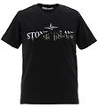 Nice Stone Island t-shirt in plain black, and on the left side there is a black brand with a white logo.