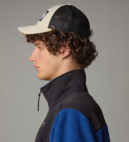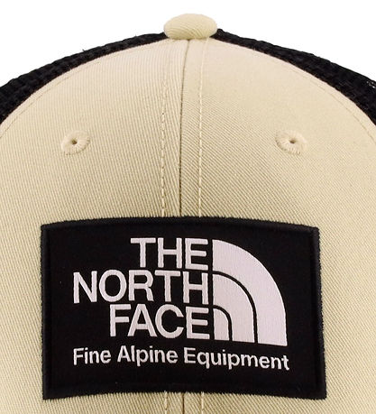 Stylish The North Face cap in a plain beige with a black mesh panel at the back. The front is adorned with an embroidered logo badge in black and white.