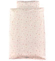 Fine Vanilla Copenhagen bedding in grey with a print of white swans and small hearts in different colours.