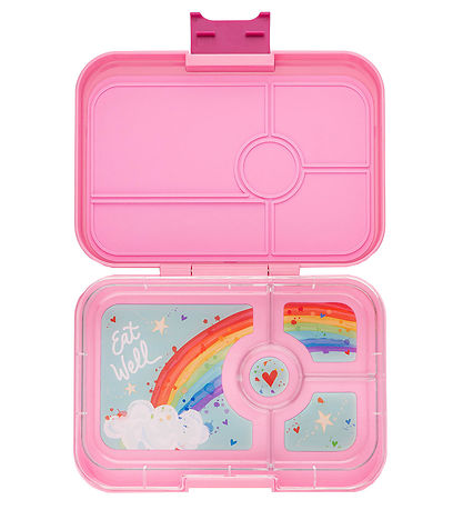 Good Yumbox lunchbox in pink, with a dark pink logo on top. The room divider has a print of rainbows, stars and hearts and the text "Eat Well".