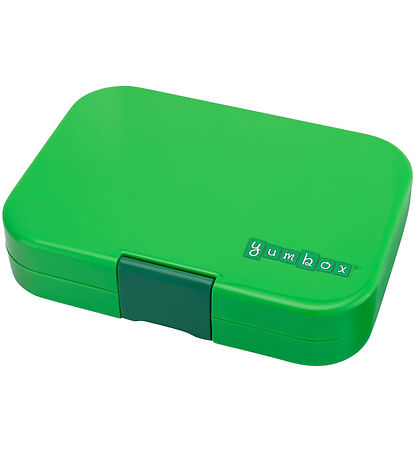 Smart Yumbox lunchbox in green with a dark green logo on top. The room divider has a green dinosaur print on a light blue background and the text "Eat Well".
