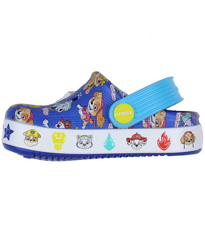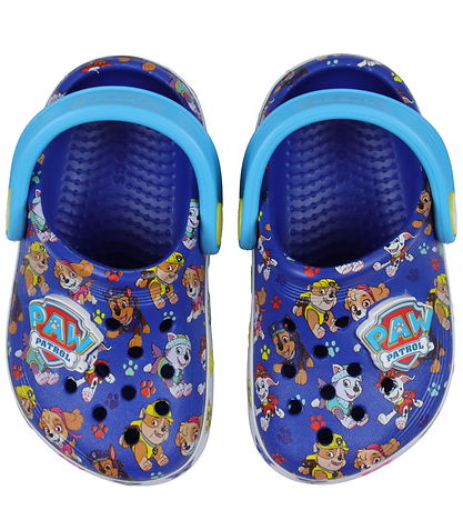 Beautiful Crocs sandals in dark blue with a print of the little Paw Patrol puppies all over. The heel strap is in light blue and the outer sole is in white. On the outside there is a little logo in yellow and white.