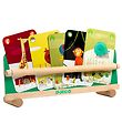 Smart Djeco card holder in green and natural wood with a motif of a dog and cat playing card on one side.