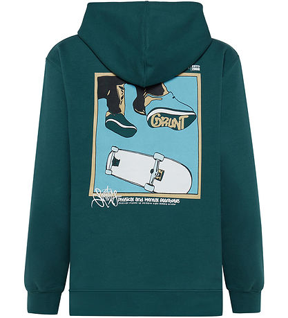 Smart Grunt hoodie in dark green sweat, and on the back there is a large, square print in blue and beige shades with a skater. The Grunt hoodie has a classic cut with a spacious kangaroo pocket and a comfortable hood. The sleeves are finished with ribbed edges that match the ribbed edge at the bottom, which gives a nice finish. On the inside, the hoodie has soft, brushed cotton.