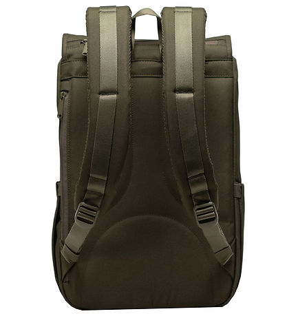 The Herschel backpack has a large compartment, where there is also a quilted, velour-lined laptop pocket, which has room for a 15/16" computer. The laptop pocket can also be accessed via a shelter lock opening on the side of the back. There are practical slip pockets on both sides of the backpack.
