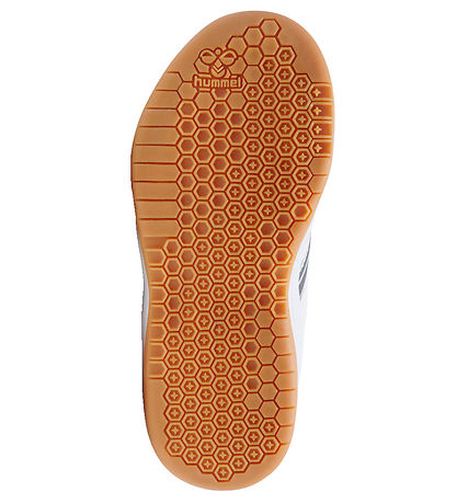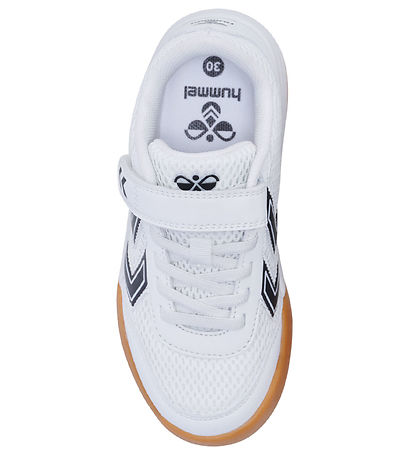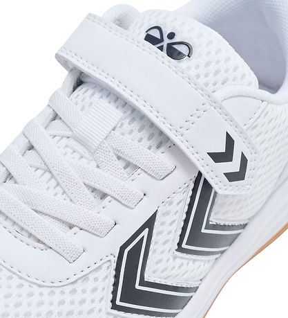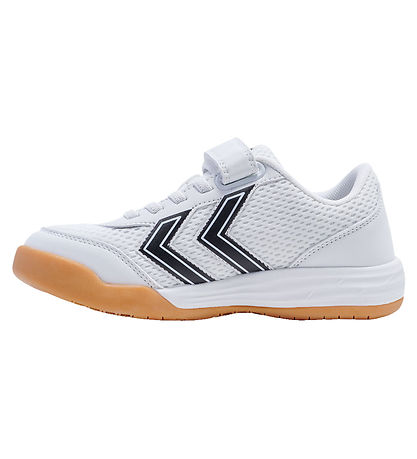 Cool Hummel indoor sports shoes in white textile and imitation leather. On both the inside and outside are the classic Hummel shevrons in black with a white border, and on the heel is the Hummel logo in black. On the tongue there is a logo application in black.