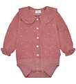 Elegant Hust and Claire shirt bodysuit in dark blue denim with soft cotton at the bottom. The shirt body has a nice collar and continuous push buttons at the front. It has long sleeves and a nice chest pocket. The shirt body closes with push buttons between the legs.