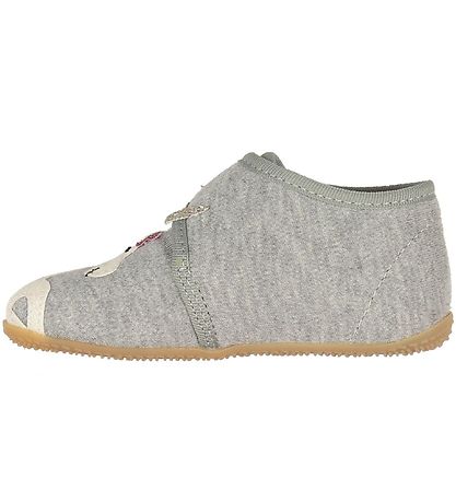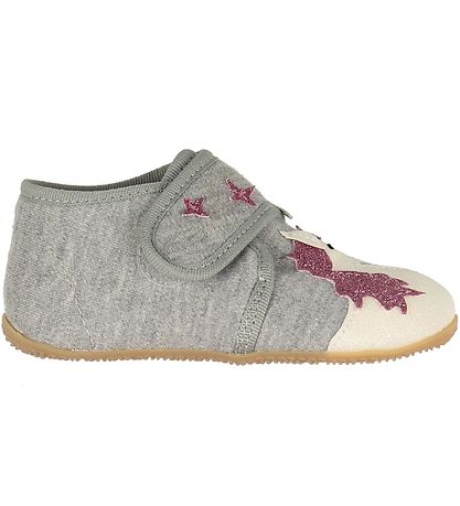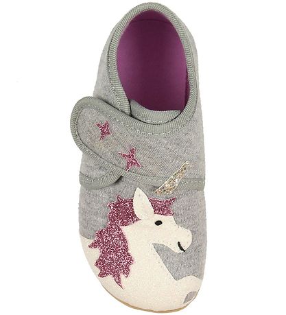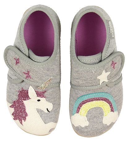 Lovely Living Kitzbühel slippers in grey cotton with two different appliqué designs. On the right foot there is a white unicorn and two stars on the strap above the ankle, while on the left foot is a cute rainbow applique in fine colours, as well as two glittering stars on the strap above the ankle.