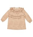 The dress has a teardrop-shaped opening at the neck, which closes with a single, inside button.
