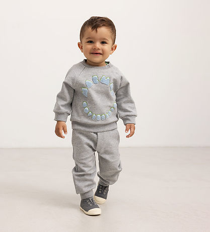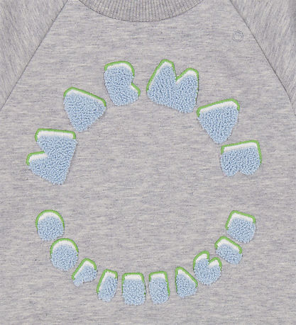 Beautiful MarMar sweatshirt in grey melange with embroidery and terrycloth applications on the front, depicting the text "MarMar Copenhagen" in light blue with a green and white background.