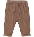 Nice Monsieur Mini corduroy trousers in brown. On the back of the right pant leg is an embroidered patch of a chocolate bar with brown terrycloth.