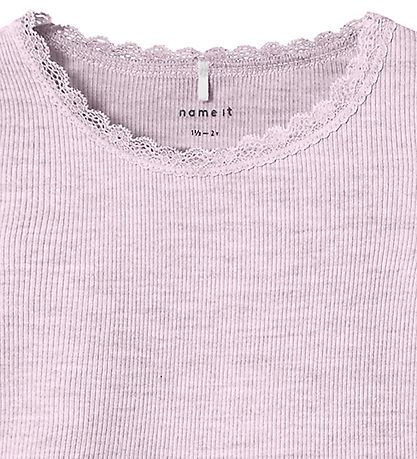 Elegant Name It blouse in pink with a ribbed structure. The Blouse from Name It has a round neckline decorated with a fine lace edge and long sleeves.