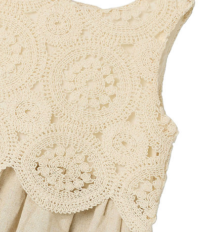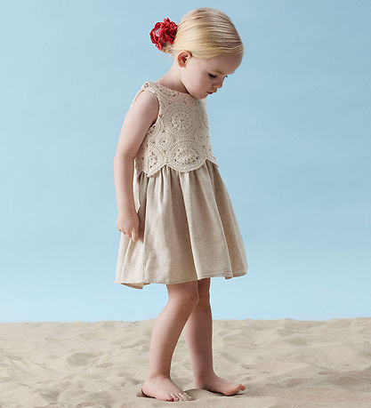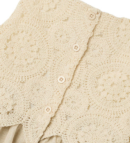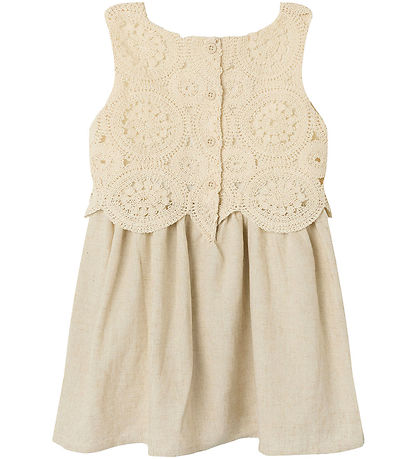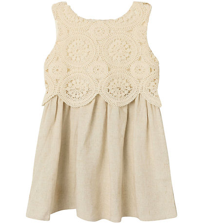 Beautiful Name It dress in a soft beige shade. The Dress has a detailed top with a crochet look in circular patterns with a woven lining so that the top is not transparent.
