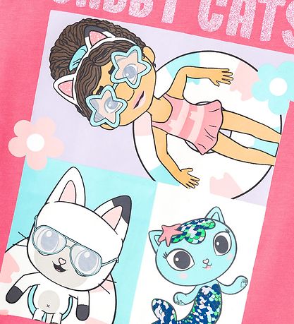 Beautiful Name It top in pink with a fine and colorful Gabby's Dollhouse print on the front, where parts of the print are with glitter.